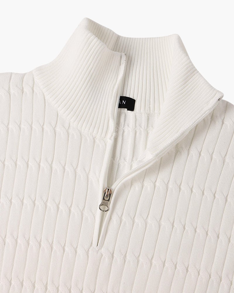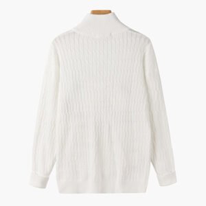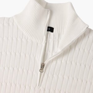 This men’s sweater is a work of intricate craftsmanship, cut from highest quality cotton that feels remarkably soft. It has meticulous wavy cable knits for a visually-appealing style, shaped with a high neck and long sleeves. Partial zipper closure lends it modernity, class and never-ending sophistication.